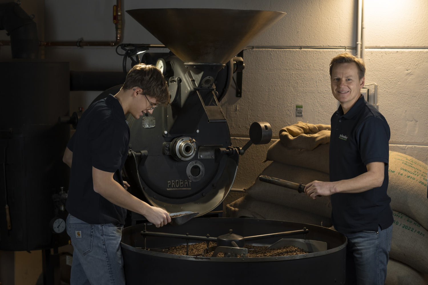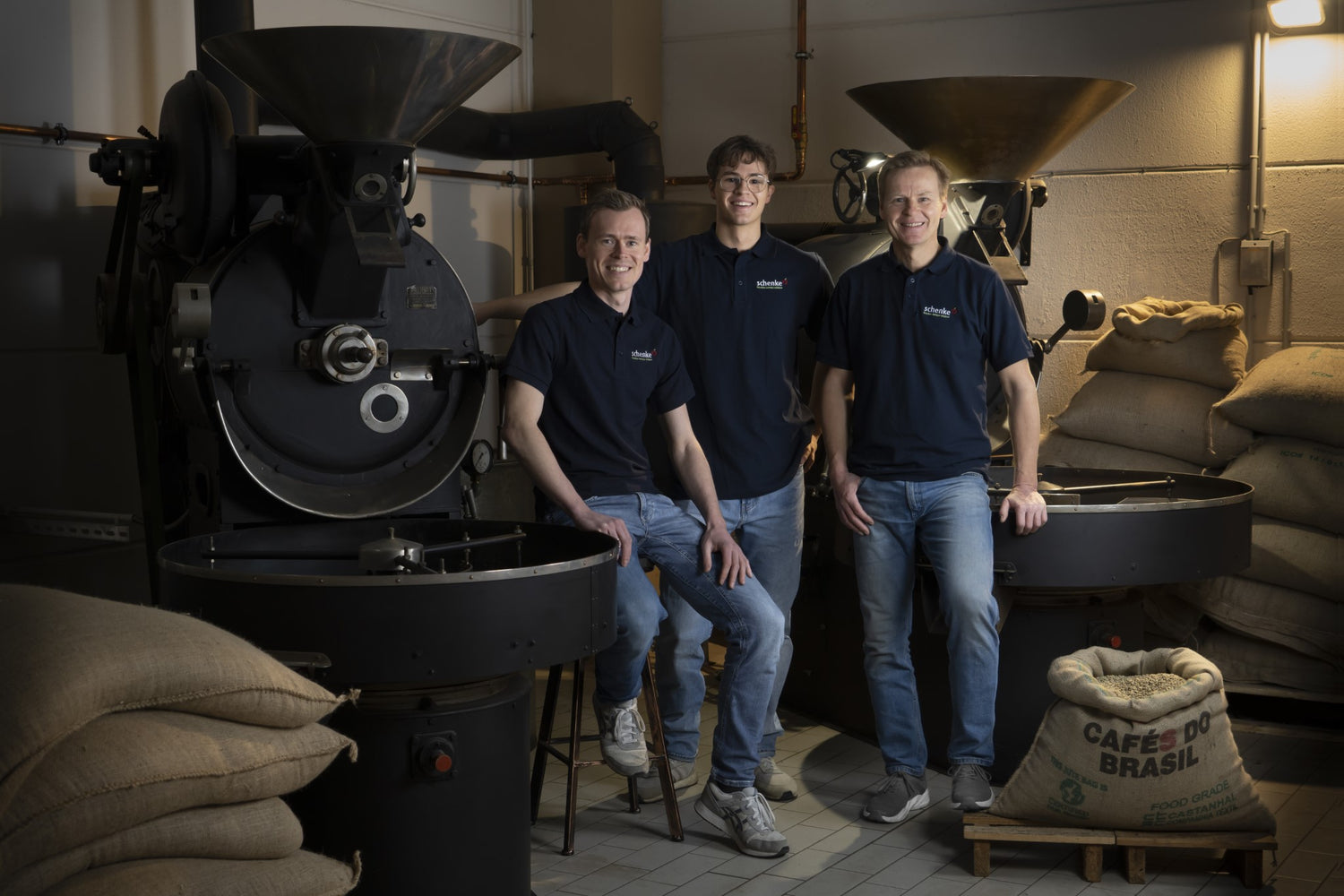 Wir sind Robin Schenke, Christian Schenke-Stumpenhausen und Jakob Leve Stumpenhausen und wir rösten den Schenke Kaffee in dritter bzw. vierter Familiengeneration. Als Röstmeister bin ich, Robin Schenke, für alle Produktionsabläufe und für das Sortiment verantwortlich. Mittlerweile unterstützen mich mein Onkel Christian und mein Cousin Jakob beim Kaffeerösten. So bleibt alles in Familienhand.